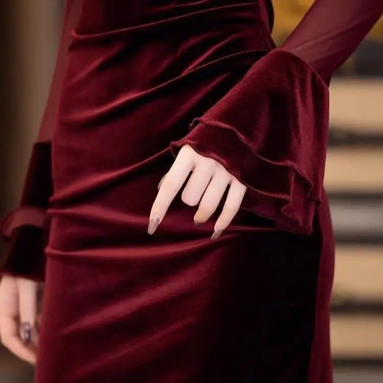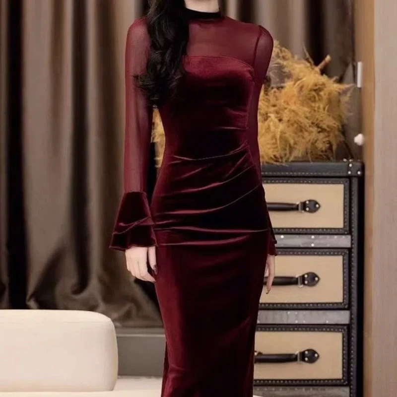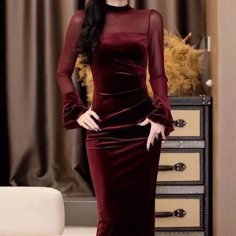 الفرنسية الرجعية مزاجه الاجتماعي نمط الخصر Cinching والتخسيس فستان الخريف موضة جديدة بأكمام طويلة وتنورة الورك المعانقة